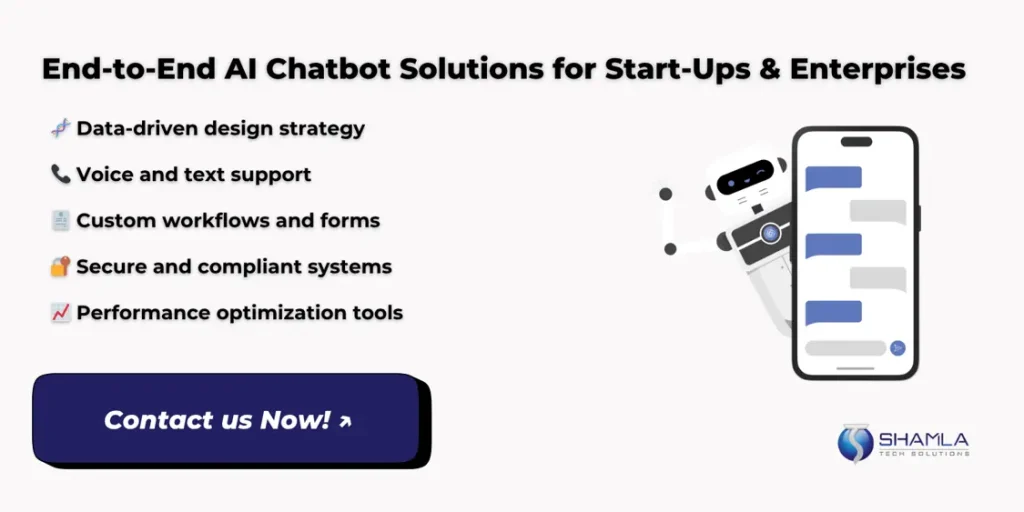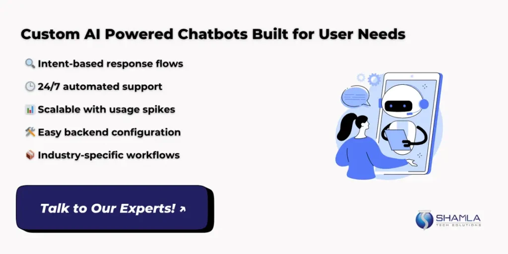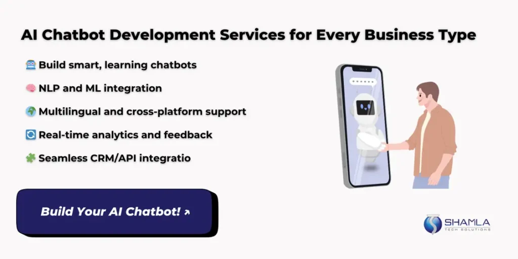 Shamla Tech is an AI chatbot development company that helps you build AI powered chatbots tailored to your brand. Our development process links your data, learns user habits, and updates itself over time. This leads to better engagement, faster issue resolution, and higher customer satisfaction, all with minimal upkeep.