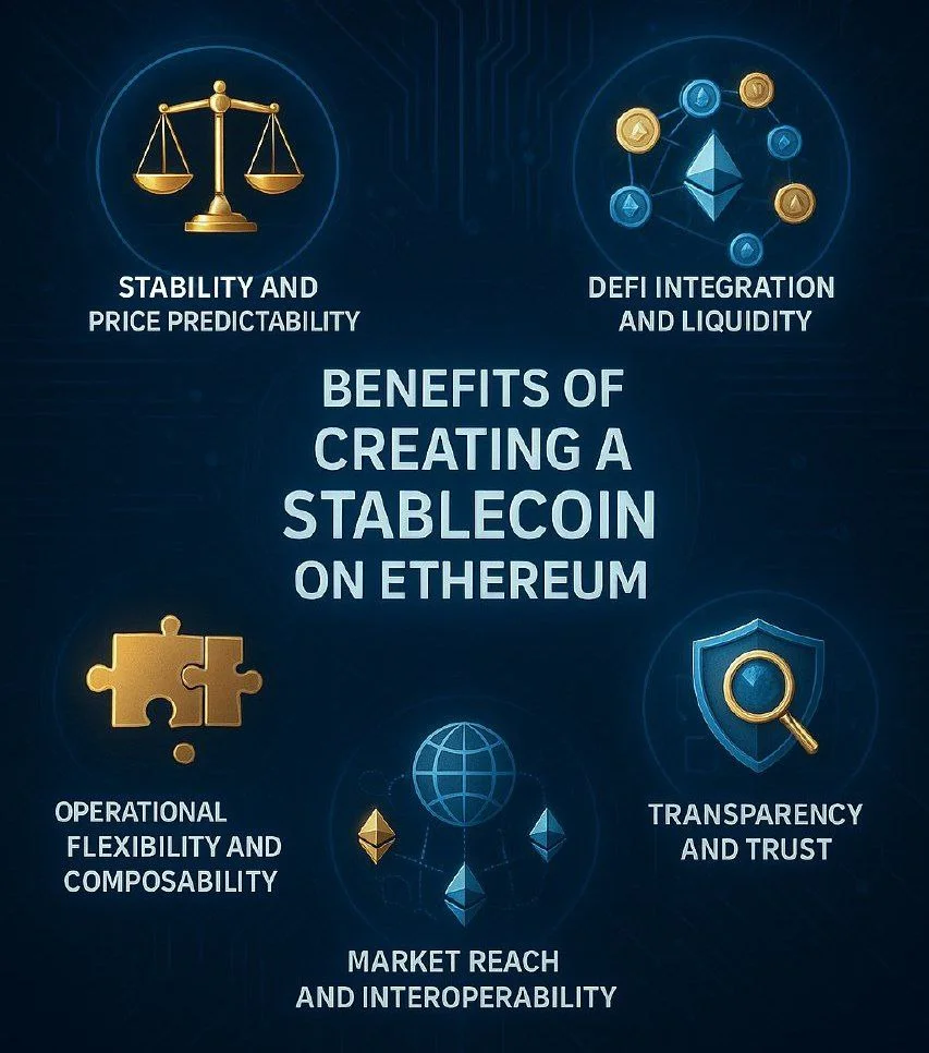 Creating stablecoins on Ethereum gives strong security, easy integration with DeFi platforms, low transaction friction, transparent ledgers, and a large developer network for ongoing upgrades and ecosystem growth.