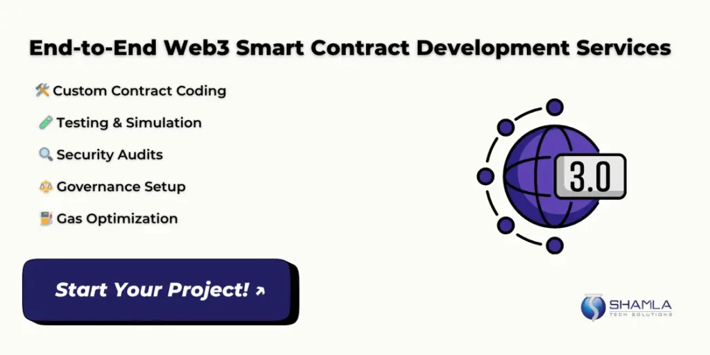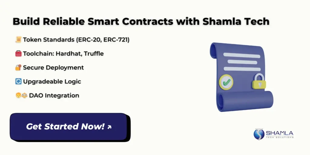 Shamla Tech is a Web3 development company that designs, codes, tests, and launches reliable smart contract solutions that are customized for real-world business use across blockchain networks. Our engineers handle coding, testing, and audit processes using industry tools like Hardhat and OpenZeppelin.