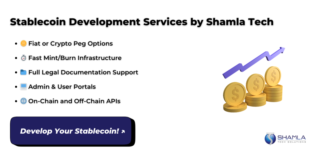 Shamla Tech is a top stablecoin development company offering the best stablecoin development services. We’ve built secure, compliant stablecoins for clients worldwide, enabling faster, cheaper transactions and seamless integration into existing finance systems.