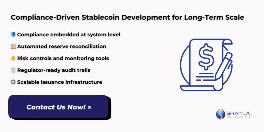 Building a global stablecoin in 2026 requires more than smart contracts – it requires compliance engineered into every layer. Shamla Tech partners with issuers to design, build, and deploy production-ready stablecoin infrastructure aligned with global regulations.