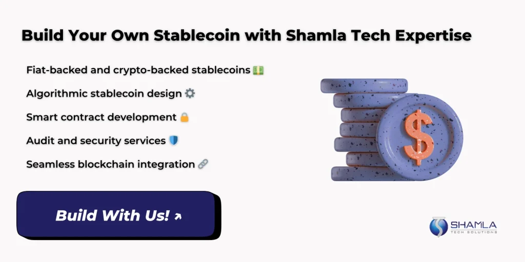 Shamla Tech is a stablecoin development company offering stablecoin development services that build compliant tokens. We design smart contract code, set up reserve accounts, and run secure audits. Clients benefit from our expertise in token architecture, legal frameworks, and integration with exchanges.