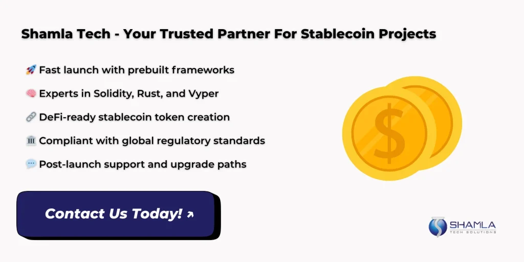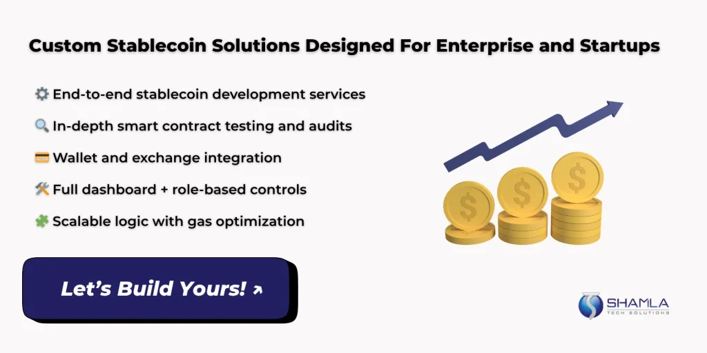 Shamla Tech is a top stablecoin development company offering expert stablecoin smart contract development services. Our experts design, audit, and deploy token code with transparent governance. We guide clients through stablecoin token creation, full reserve setups, and compliance checks. Partner with us to launch reliable, low‑volatility tokens tailored to your business needs.